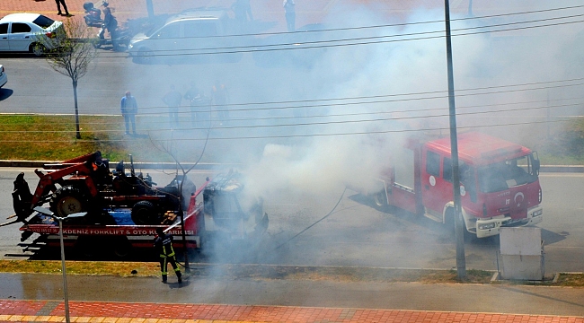 Edinilen bilgiye göre, üzerinde traktör bulunan çekici seyir halindeyken henüz belirlenemeyen bir nedenle ön tarafından bir anda alev aldı. Çekicinin sürücüsü ve çevredekiler yangına müdahale etmek istese de alevler bir anda büyüdü. İhbar üzerine olay yerine gelen itfaiye ekipleri, kısa sürede alevlere müdahale ederek yangını söndürdü. Yangında traktör zarar görmezken, çekicinin ön kısmı küle döndü.