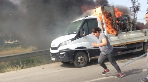 Antalya-Serik D 400 karayolunda öğle saatlerinde üzerinde klima üniteleri yüklü olan 07 MBA 04 plakalı araç seyir halindeyken alev aldı.