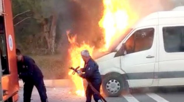 Seyir halindeki minibüs alev alev yandı