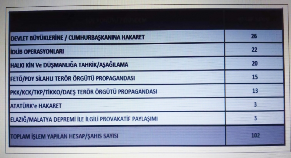 Malatya'da il Emniyet Müdürlüğü'nden yapılan açıklamada Siber Suçlarla Mücadele Şube Müdürlüğü ekiplerince 1 Ocak ile 8 Aralık tarihleri arasında yapılan çalışmalarda sosyal medya üzerinde 'Devlet Büyüklerine - Cumhurbaşkanına hakaret, İdlib Operasyonları, Halkı Kin ve Düşmanlığa Tahrik veya Aşağılama, FETÖ/PDY Silahlı Terör Örgütü propagandası, PKK/KCK/TKP/TİKKO/DEAŞ/ Terör örgütü propagandası, Atatürk'e hakaret, Elazığ- Malatya depremi gibi konularda dezenformasyon yaptığı belirlenen 102 kişi hakkında işlem yapıldığı kaydedildi.