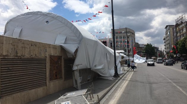 Yaya ve araç trafiğinin yoğun olduğu sırada yaşanan olayda şans eseri kimseye zarar gelmezken, çadır belediye ekiplerince hemen yoldan kaldırıldı.