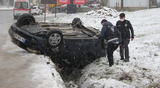 Takla atan araçta sıkışan kadın sürücü, sıkıştığı yerden itfaiye ekiplerince kurtarıldı. Kazayı hafif sıyrıklarla atlatan sürücü, Ferizli Devlet Hastanesine kaldırılarak tedavi altına alındı. Polis kazayla ilgili inceleme başlattı.