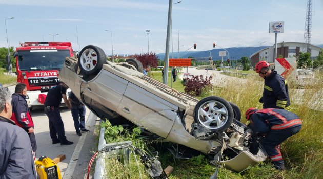 Düzce Kuzey çevre yolunda kontrolden çıkan otomobilin takla atarak refujdeki ağaçlara ve elektrik direğine çarptı.