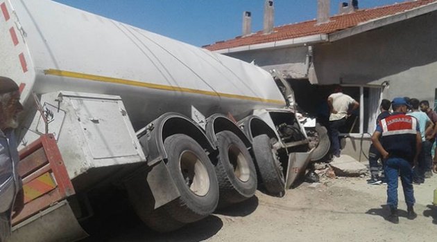 Bursa'nın Büyükorhan ilçesinde akaryakıt tankeri eve daldı.