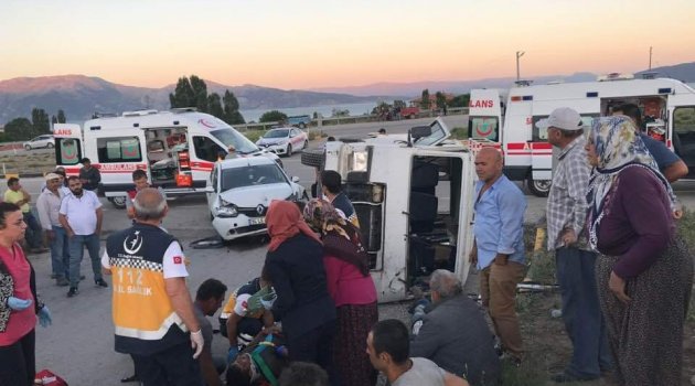 Isparta’nın Senirkent ilçesinde otomobille tarım işçilerini taşıyan minibüsün çarpışması sonucu meydana gelen trafik kazasında 11 kişi yaralandı.