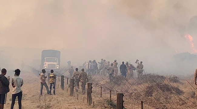 Çarşamba günü çıktığı belirtilen yangının 8 bin dönümlük araziye yayıldığı, söndürme çalışmalarının devam ettiği belirtildi. Tüm tatbikatların da durdurulduğu aktarıldı.
