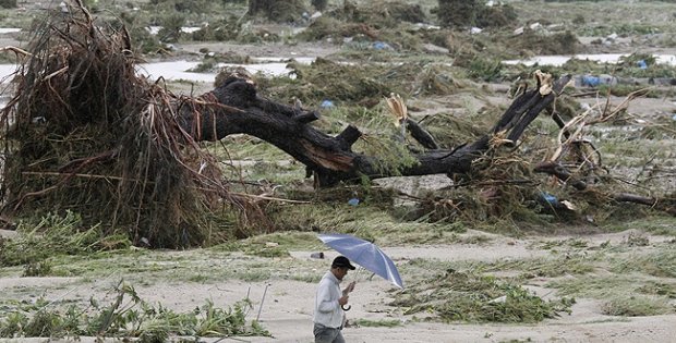 Çin'in güneyindeki Guangdong şehrinde şiddetli fırtına ve sağanak yağmur sonrası bölgeyi sel aldı. Saatte 151 kilometre hızla esen rüzgar dev ağaçları köklerinden söktü.
