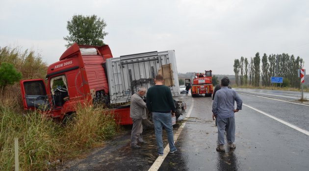 Tekirdağ’da sabah saatlerinde yağış sebebiyle bir tır yoldan çıktı.