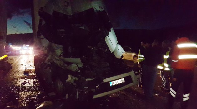 Alınan bilgiye göre kaza, akşam saatlerinde TEM otoyolu Kaynaşlı mevkiinde meydana geldi. Ankara istikametine gitmekte olan A.B.’nin kullandığı 14 GL 469 plakalı tır, arıza şeridinde bekleyen E.P.’nin kullandığı 34 PG 542 plakalı tıra arkadan çarptı. Çarpmanın etkisiyle arkadan çarpan tır hurdaya dönerken sürücü A.B. ile arıza şeridinde bekleyen tırdaki Y.E.P. ve ağabeyi A.P. yaralandı.