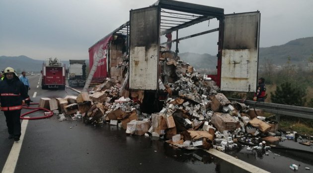 Düzce TEM Otoyolu Kaynaşlı ilçesi mevkisinde tıbbi ilaç yüklü tır seyir halindeyken yanmaya başladı. İtfaiye ekiplerinin müdahalesi sonucunda yangın söndürüldü.