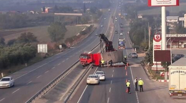 Kaza, sabah saatlerinde Bursa-İzmir yolu Gölyazı Mevkisi'nde meydana geldi. Dorseli tırın yan yatması sonucu yol araç trafiğine kapandı. Polis ekiplerinin güvenlik önlem aldığı yolda yan yatan tır kaldırıldıktan sonra ulaşım yeniden açıldı.