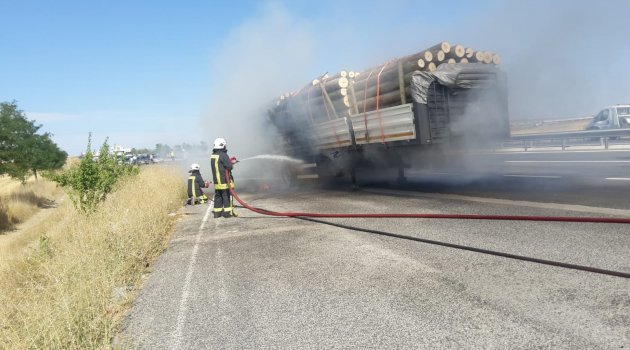 Konya’nın Kulu ilçesinde tomruk taşıyan tırın dorsesinde alev alan lastiği itfaiye ekipleri söndürdü.