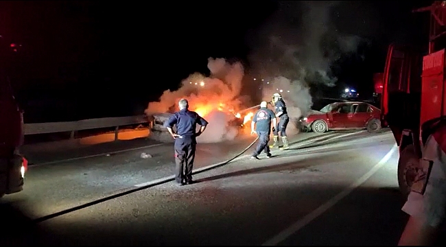 Sürücüsünün kontrolünden çıkan otomobil bariyerlere çarparak alev aldı. Motor kısmından alevlerin yükseldiği sürücüsü canını zor kurtardı. Olay yerine itfaiye ekipleri ile birlikte sağlık ekipleri sevk edildi. Hafif şekilde yaralanan her iki araç sürücüsü ile bir yolcu ambulanslarla kentteki hastanelere sevk edildi. Alevlere teslim olan otomobil tamamen yanarak kullanılamaz hale geldi. Jandarma ve polis ekipleri kazayla ilgili inceleme başlattı.