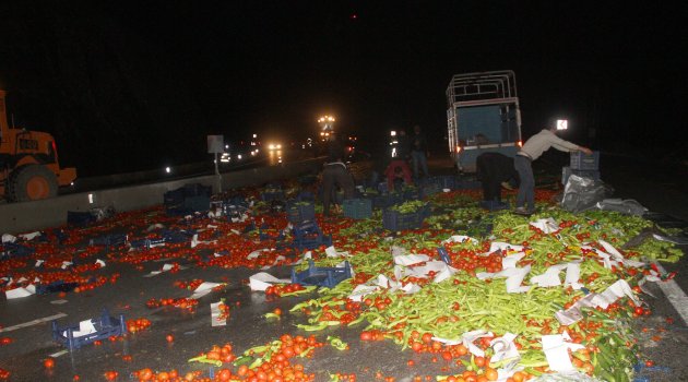 Muğla’nın Fethiye ilçesinde, domates ve sebze yüklü bir kamyon, sürücüsünün direksiyon hakimiyetini kaybetmesi sonucu devrildi. Tonlarca domates ve sebze yola saçılırken kamyonda bulunan 3 kişi yaralandı.