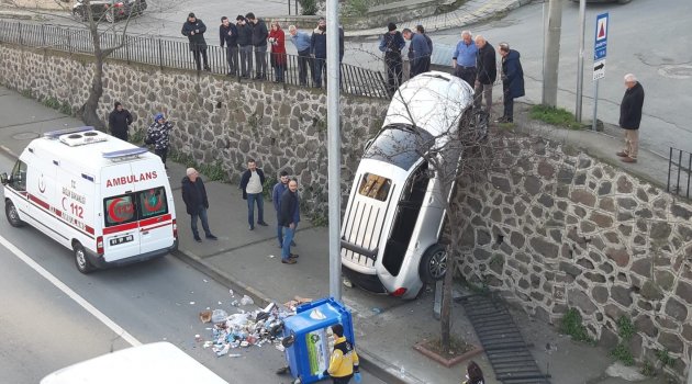 Trabzon'un Akçaabat ilçesinde meydana gelen ilginç kazada geri kayarak yola düşen araç duvarda asılı kaldı.