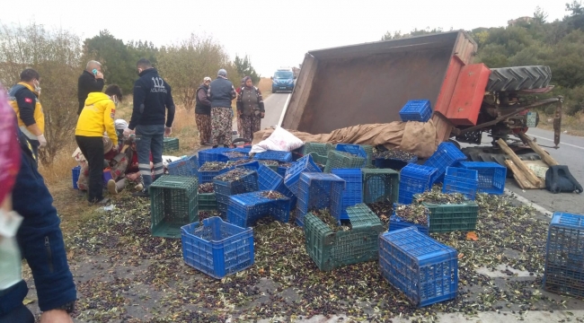 Olay, Çanakkale'nin Ezine ilçesi Geyikli beldesinde meydana geldi. Edinilen bilgiye göre, zeytin hasadından dönen tarım işçilerini taşıyan Halil Saydanın kullandığı 17 SD 599 plakalı traktör devrildi. Zeytinlerle birlikte kasada bulunan tarım işçileri de yola savuldu. Yoldan geçen diğer işçilerin yardımı ile kasaların altında kalanlar çıkarıldı. İhbar üzerine olay yerine çok sayıda ambulans sevk edildi. Yaralılar ambulanslarla Ezine Devlet Hastanesine kaldırılarak tedavi altına alındı.