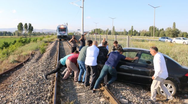 Sivas’ta yoldan çıkan otomobil tren raylarında asılı kaldı, yaklaşan tren ise paniğe neden oldu.