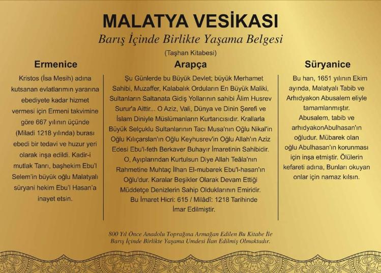 Malatya Vesikası olarak yerini alan kitabenin üzerindeki Arapça yazıların Türkçe tercümesi şöyle: “Şu günlerde bu büyük devlet,  büyük merhamet sahibi, muzaffer, kalabalık orduların en büyük Mâliki, sultanların saltanatına gidiş yollarının sahibi Âlim Surur’a aittir. O aziz, vali, dünya ve dinin şerefi ve İslam diniyle Müslümanların kurtarıcısıdır. Krallarla büyük Selçuklu Sultanlarının tacı Musa’nın oğlu Nikal’in oğlu, Kılıçarslan’ın Oğlu, Keyhüsrev’in oğlu Allah’ın Aziz Edesi Ebu’l-Fetih Berkaver Buhayır İmaretinin sahibidir. O, ayıplarından kurtulsun diye Allah Teâlâ’nın Rahmetine muhtaç İlhan El-Mübarek Ebu’l-Hasan’ın oğludur. Karalar beşikler olarak devam ettiği müddetçe denizlerin sahip olduklarının emiridir”