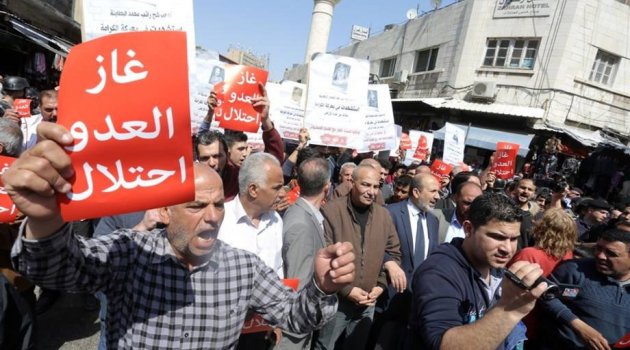 Ürdün'de yüzlerce kişi Ürdün-İsrail arasında imzalanan doğalgaz anlaşmasını protesto etti. Başkent Amman'da toplanarak anlaşmanın iptal edilmesini talep eden Ürdün halkı, hükümeti İsrail’e destek vermekle suçladı. Ürdünlüler ayrıca, "Düşmandan gaz almak istemiyoruz", "İsrail ile gaz anlaşması iptal edilsin" yazılı dövizler taşıdı.