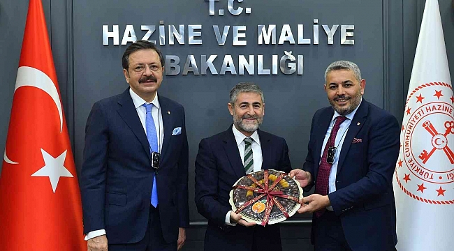 Türkiye Odalar ve Borsalar Birliği (TOBB) Başkanı M. Rifat Hisarcıklıoğlu ve TOBB Yönetim Kurulu Üyeleri Hazine ve Maliye Bakanı Nureddin Nebati ile bir araya geldi. Hazine ve Maliye Bakanlığı'nda yapılan görüşmeye TOBB Yönetim Kurulu Üyesi ve Malatya Ticaret ve Sanayi Odası (MTSO) Başkanı Oğuzhan Ata Sadıkoğlu da katıldı. Başkan Sadıkoğlu, "Türkiye Ekonomi Modeli"nin işleyişi ve yansımalarının ele alındığı görüşme sonrası Hazine ve Maliye Bakanı Nureddin Nebati'ye Avrupa Birliği (AB) Coğrafi İşaret Tescilli Malatya Kayısısı takdim etti.