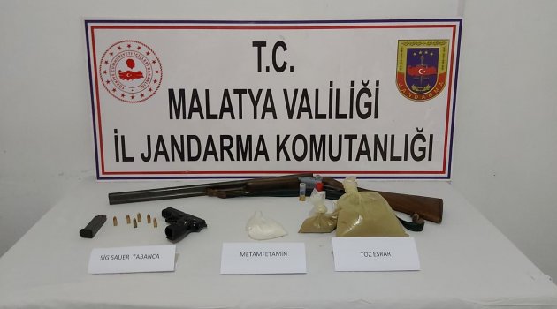 Doğanyol’a bağlı bir mahallede uyuşturucu madde imal ve ticareti yapıldığı bilgisini alan jandarma ekipleri, adli makamlardan alınan arama kararına istinaden 1 şüphelinin ev, iş yeri ve eklentilerinde uyuşturucu madde tespit köpeği “Ekip” ile arama yaptı. Yapılan aramalarda 762 gram toz esrar maddesi, 96 gram metamfetamin, 1 adet ruhsatsız tabanca, 1 adet ruhsatsız av tüfeği ele geçirildi.