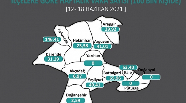 Malatya İl Sağlık Müdürlüğü tarafından ilçelere göre haftalık Covid-19 vaka sayısı yayımlandı. Yayımlanan il bazlı listeye göre iki ilçede sıfır vaka kaydedilirken, Kuluncak ilçesi yüz binde 146,41 ile en fazla korona virüs vakası ilçe oldu. Covid-19 vaka sayılarının sürekli düşüş gösterdiği Malatya’da Pütürge ve Doğanyol ilçelerinde 12-18 Haziran tarihleri arasında sıfır vaka kaydedildi. İlçelere göre haftalık vaka sayısında 65,96 ile Battalgazi ilçesinde de rakamın yüksek olduğu vurgulandı.