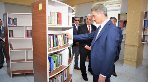 Okuldaki incelemelerde kütüphaneyi, resim atölyesini, laboratuvarı sınıfları inceleyerek okul müdüründen detaylı bilgiler aldı.