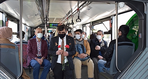 HASAN ERYILMAZ/ İçişleri Bakanlığı tarafından 81 il valiliğine gönderilen "haftalık tematik denetimler" genelgesi kapsamında Malatya'da toplu taşıma araçlarında maske ve mesafe denetimi gerçekleştirildi. Malatya İl Emniyet Müdürü Ercan Dağdeviren'inde katılımlarıyla şehrin belli noktalarında yapılan denetimlerde sosyal mesafe ve maske denetimi yapılarak vatandaşlara uyarılarda bulunuldu. Denetimlerde araç sürücüleri ve vatandaşlarla sohbet eden İl Emniyet Müdürü Dağdeviren, kalabalık ortamlardan uzak durmaları tavsiyesinde bulunurken orta risk grubunda yer alan Malatya'nın maviye dönüşmesi için hep birlikte mücadele edilmesinin önemine vurgu yaptı. Demetimler de 8 Mart Dünya Kadınlar Günü dolayısıyla kadın yolculara da karanfil dağıtan İl Emniyet Müdürü Dağdeviren, şiddetten uzak kadınların baş tacı edildiği bir gelecek ümit ettiklerini dile getirdi.
