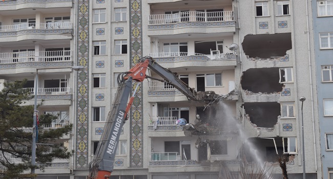 HASAN ERYILMAZ/Malatya'da Elazığ depreminde ağır hasar gören binaların yıkımına başlandı.Elazığ'da meydana gelen 6.8 şiddetindeki depremin ardından, Sivas Caddesi'ndeki çökme riski olan 6 katlı bir bina boşaltıldı.Tahliye işlemlerinin ardından,Yağmur Apartmanı'nda risk tespit edilip yıkımına karar verilirken,yıkım öncesi polis,itfaiye ve AFAD ekipleri çevrede güvenlik tedbiri aldı.Alınan tedbirlerin ardından binanın yıkımına başlandı.Kent genelinde ağır hasarlı olduğu tespit edilen, 50'den fazla binanın yıkım işlemlerinin peyderpey gerçekleştirileceği öğrenildi.