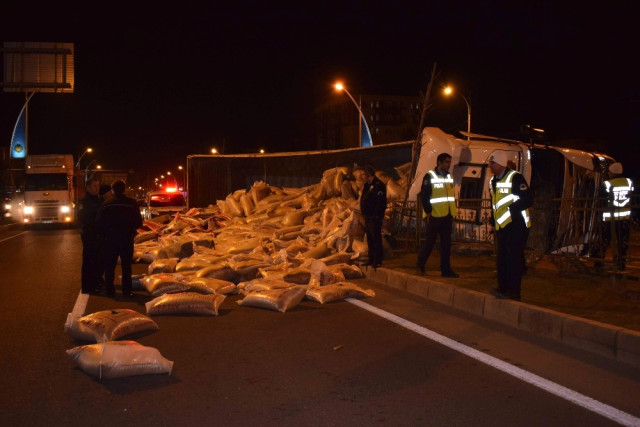 HASAN ERYILMAZ/ Malatya'da sürücüsünün direksiyon başında uyuduğu iddia edilen hayvan yemi taşıyan tır devrildi.Kazada tır şoförü yaralandı. Edinilen bilgilere göre,Mersin'den Elazığ'a hayvan yemi taşınan 53 yaşındaki Süleyman Alagöz idaresindeki 23 KA 947 plakalı tır çevre yolu Niyazi Mısri cami mevkiinde sürücünün direksiyon hakimiyetini kaybetmesi sonucu orta refüje çarparak yan yattı. Tır'da bulunan hayvan yemleri yola saçıldı. İhbar üzerine olay yerine gelen polis ekipleri olası bir kazanın yaşanmaması için yolda güvenlik önlemi alırken kazada hafif şekilde yaralanan sürücü Alagöz olay yerine gelen ambulansla Malatya Eğitim ve Araştırma Hastanesine kaldırılarak tedavi altına alındı. Devrilen tır çekici yardımıyla kaldırılırken, kazayla ilgili soruşturma başlatıldı.