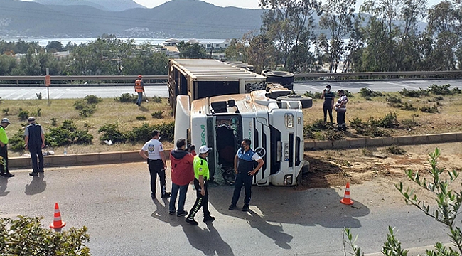 Muğla'nın Bodrum ilçesinde viraja hızlı giren sürücüsünün direksiyon hakimiyetini kaybettiği tırın refüje devrilmesi sonucu bir kişi yaralandı.