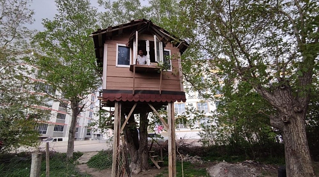 Evin yapımında bahçelerindeki eski eşya ve ağaç parçalarını kullandıklarına değinen Otçu, “Ayakları için ağaçtan telefon direğini mantoladık. Geri dönüşüm olan ürünleri de kullandık. Lüks, abartılı malzemeler kullanmadık. Tamamen kendimize ait araç ve gereçlerden oluşan bir eser ortaya çıkardık. Daha sonra diğer ağaçlarımıza da bu tarz ev yapmaya devam edeceğiz” şeklinde konuştu.