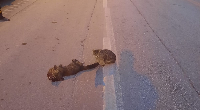 Başka bir kediyse yaralı arkadaşının başına gelerek, can çekiştiği anlarda yanından ayrılmadı. Görenleri duygulandıran anlar bir vatandaş tarafından da cep telefonuyla görüntülendi.