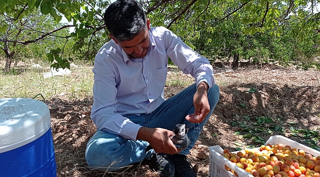 Çiftçi Bilal Korkmaz, yavru kargaya elleriyle su içirdiğini belirterek, “Kayısı topluyorduk, yavru yuvadan düşmüş. Su verdik ve tekrar yerine bırakacağız. Hayvan susamıştı. Ellerimizle su içirdik. Doydu, sıcaktan baygınlık geçiriyor” diye konuştu.