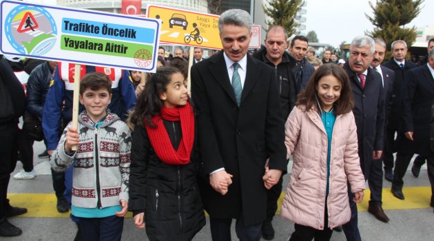 Konuşmaların ardından Vali Baruş ve diğer yetkililer öğrencilerle birlikte yaya geçidinden karşıya geçti. Öğrencilerde ellerindeki dövizlerle yaya geçitlerinin önemine vurgu yaparken, sürücülere de proje ile ilgili broşürler dağıtıldı.