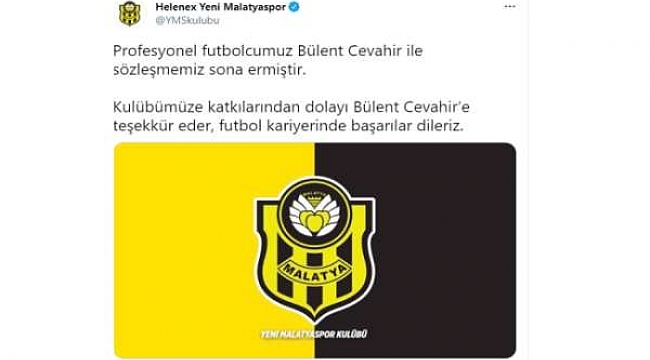 Yeni Malatyaspor söz konusu sosyal medya paylaşımında, “Profesyonel futbolcumuz Bülent Cevahir ile sözleşmemiz sona ermiştir.