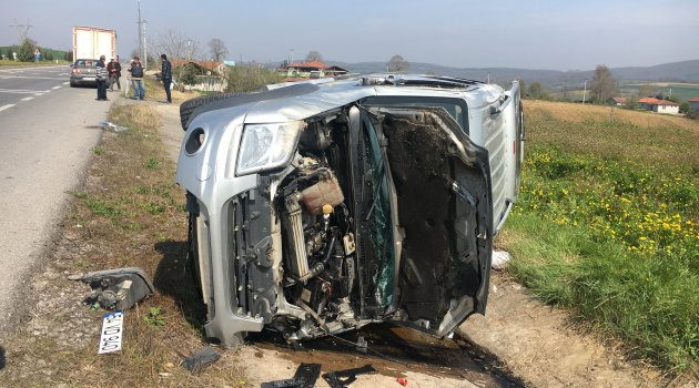 Sakarya’nın Adapazarı ilçesinde meydana gelen trafik kazasında yoldan çıkan araç yan yattı.