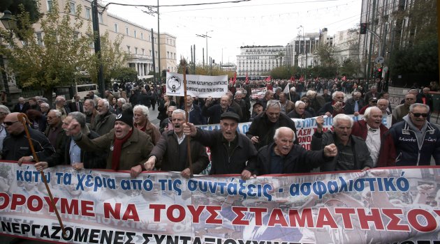 Yunanistan’ın dört bir yanından binlerce emekli Atina’da toplandı. Maaşlarının iade edilmesi için çağrı yapan emekliler pankart açarak maaşlarının geri ödenmesi için slogan attı.
