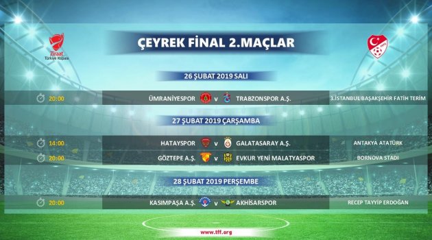 Ziraat Türkiye Kupası Çeyrek Final'in 26, 27 ve 28 Şubat tarihlerinde oynanacak rövanş karşılaşmalarının programı belli oldu.